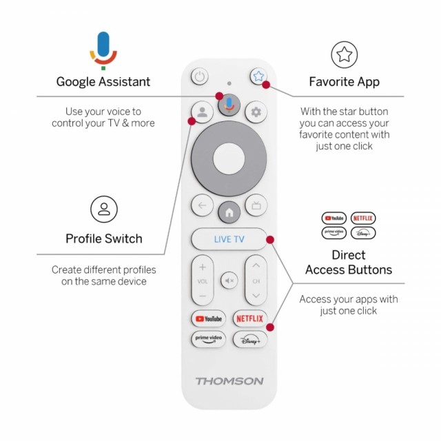 Den medfølgende Bluetooth-fjernkontrollen har Google Assistant-støtte for håndfri navigering. Bare si hva du ønsker for å finne populære YouTube-klipp eller de nyeste storfilmene. Fjernkontrollen har også direkteknapper for rask tilgang til dine mest brukte apper.